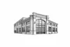 A modern commercia development featuring several buildings with large windows and slanted roofs, surrounded by landscaping with trees and shrubs. There is a parking lot with cars and a person riding a bicycle nearby. The sky is clear with few clouds.